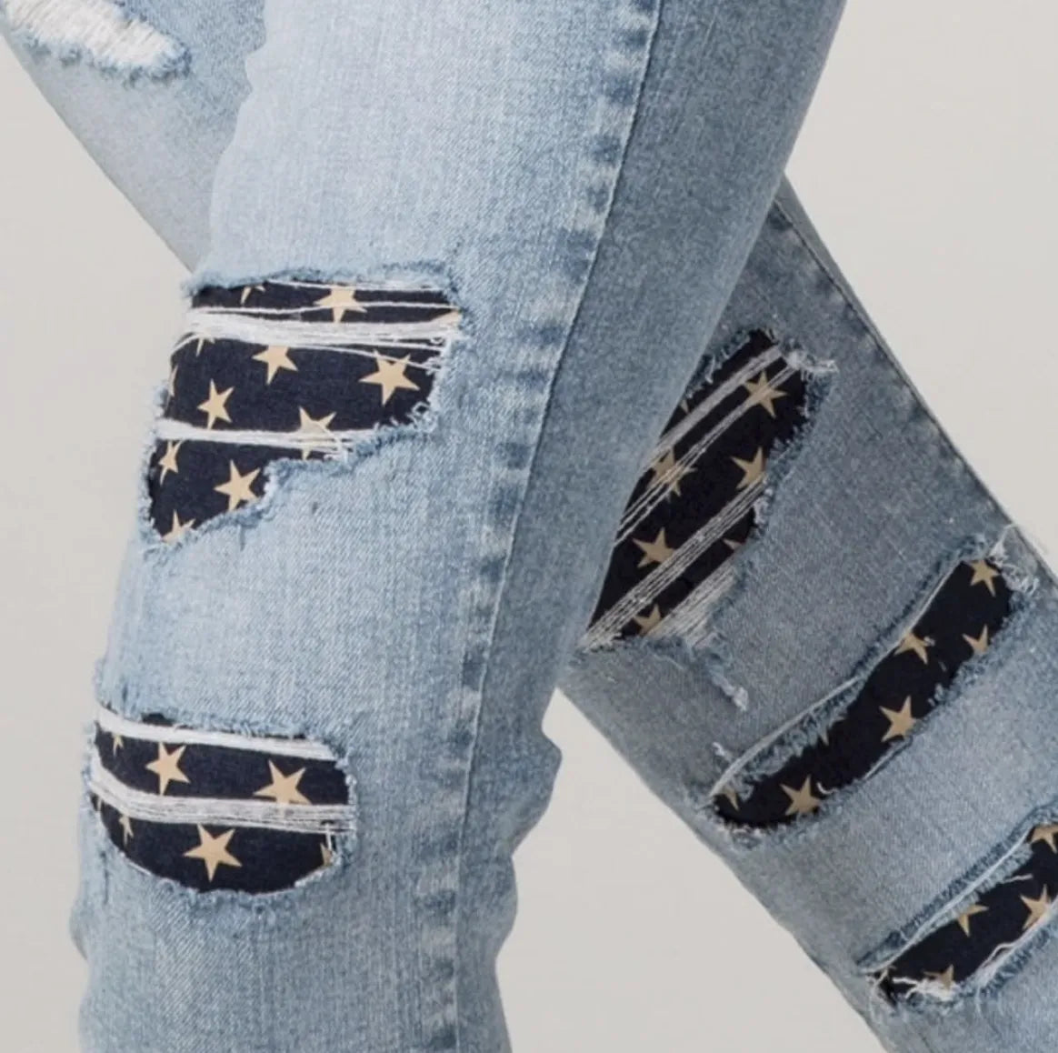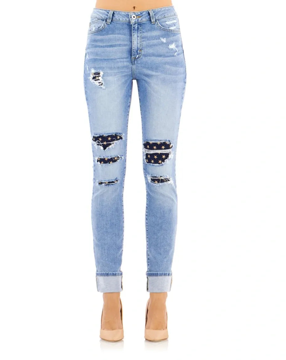 Sexy Boyfriend Fit with a star printed fabric detail under destruction for a classic Americana vibe.