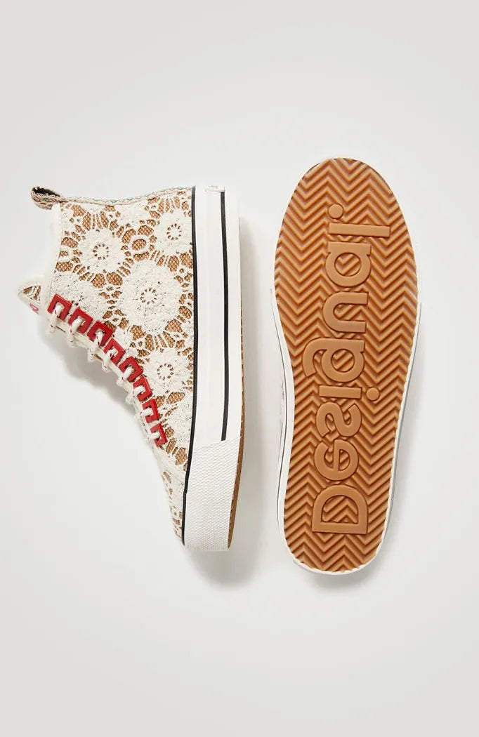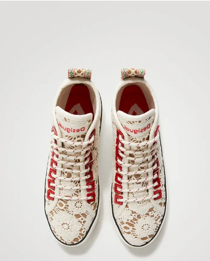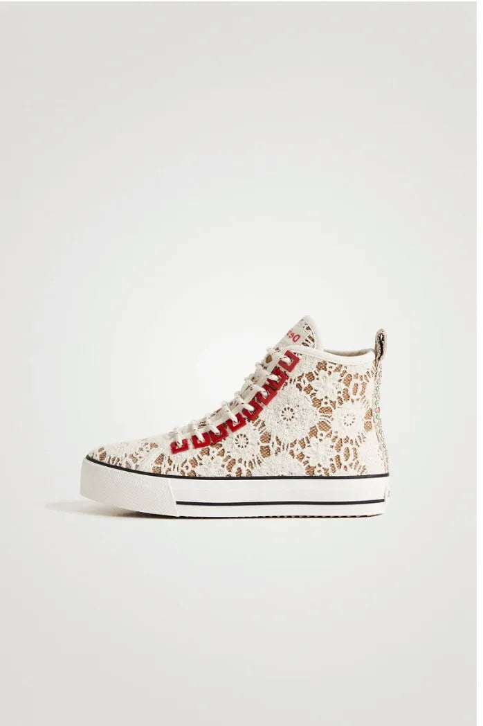 The lace, jute, square eyelets and long tongue with an ethnic print make these high-top sneakers a unique piece.