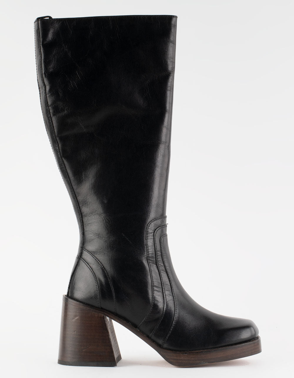 The ANDIEE leather boot is a knee high square toe design finished with a angled stacked heel and decorative stitching.